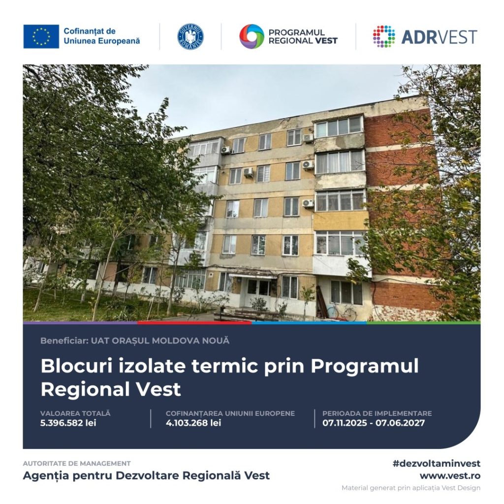 UNITATEA ADMINISTRATIV TERITORIALĂ ORAȘUL MOLDOVA NOUĂ implementează proiectul „Eficientizarea energetică a clădirii de apartamente rezidențiale situate în orașul Moldova Nouă, pe Aleea Mihai Viteazu, bloc 17, Oraș Moldova Nouă” cod SMIS: 347336, prin Programul Regional Vest 2021-2027, în baza contractului de finanțare nr. 309/07.11.2025.