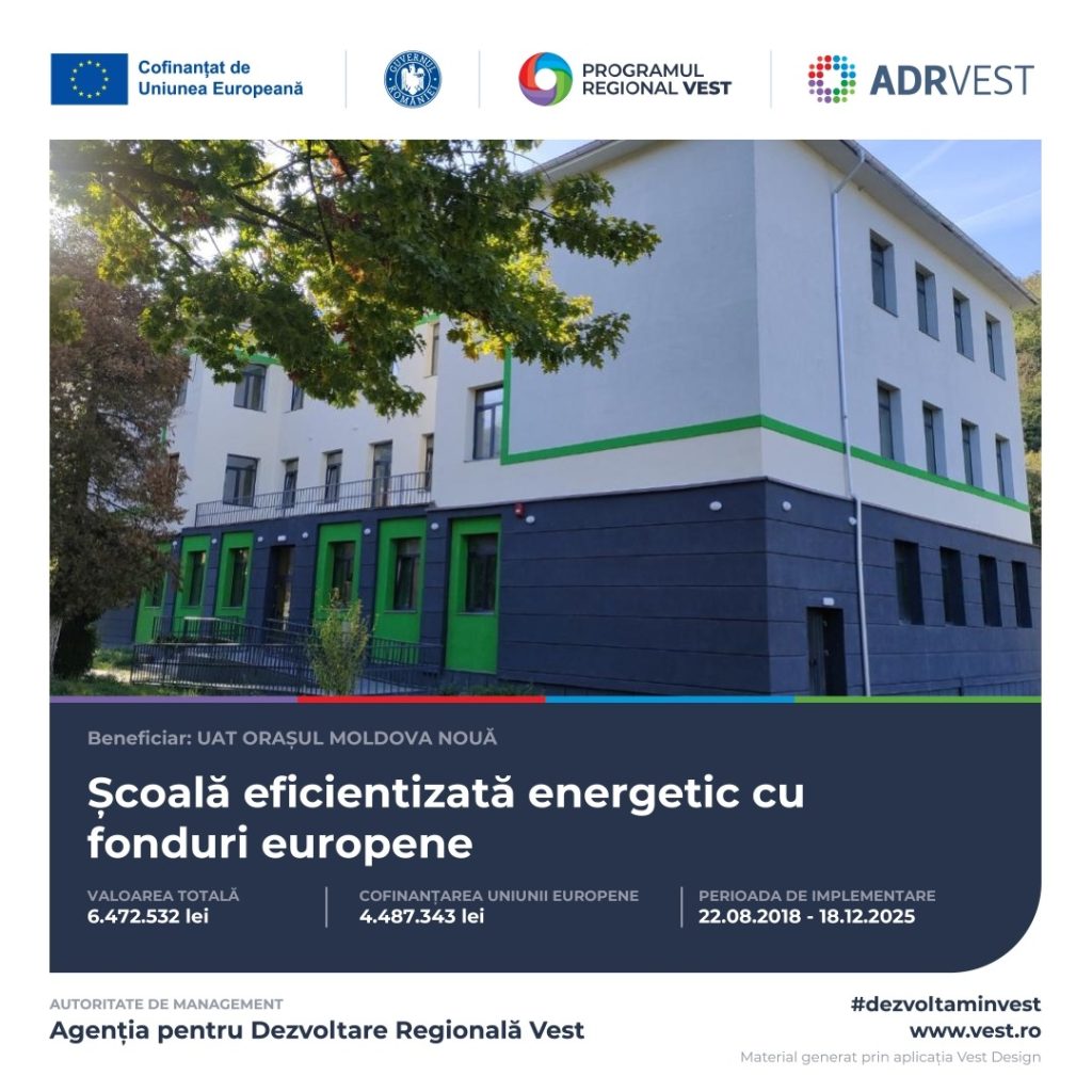 UNITATEA ADMINISTRATIV TERITORIALĂ ORAȘUL MOLDOVA NOUĂ implementează proiectul „Reabilitare, modernizare Scoala Gimnazială ”Alexandru Moisi” Moldova Nouă, Sala de sport și dependințe”, din cadrul Programului Operational Regional 2014-2020, Cod SMIS 324371 finanțat prin REGIO – Programul Operațional Regional 2014-2020 – etapa 1 și prin Programul Regional Vest 2021-2027 – etapa 2, în baza contractului de finanțare nr. 61/18.07.2024.